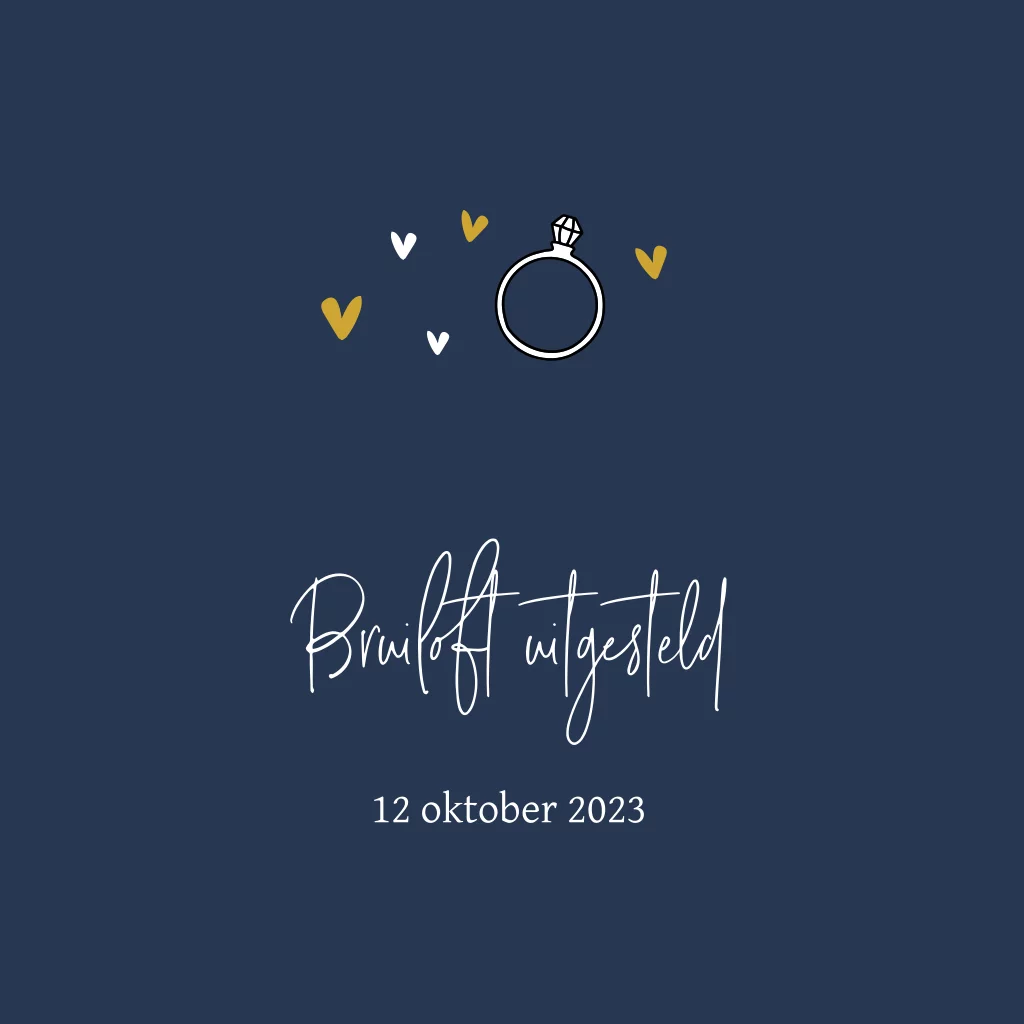 Ah wat jammer de bruiloft moet uitgesteld worden. Maar met deze stijlvolle kaart kun je iedereen hiervan toch leuk op de hoogte brengen. Op de donkerblauwe achtergrond komt de witte tekst en de ring extra goed uit. Je kunt zelf de tekst en kleuren aanpassen, dit doe je in de online editor.