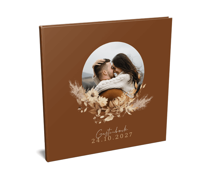 Vierkant gastenboek in de stijl van de bohemian trouwkaart, op het roodbruine boek staat een toef droogbloemen onder de ronde foto. Upload een romantische foto van jullie samen en zorg voor een mooi aandenken na jullie bruiloft met dit stijlvolle gastenboek!