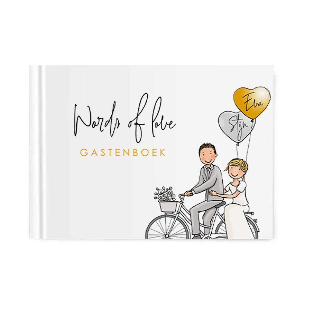 Vrolijk gastenboek met bruidspaar op de fiets en ballonnen. Specificaties van het gastenboek