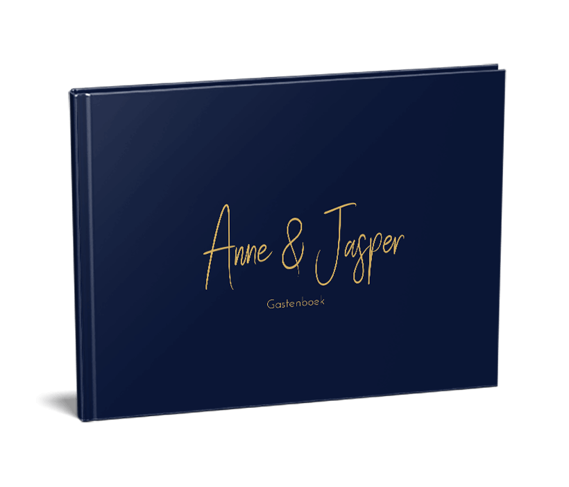 Stijlvol donkerblauw gastenboek met de tekst in sierlijke goudkleurige letters. Wil je liever een ander lettertype? Dat kan natuurlijk ook, pas het zelf eenvoudig aan in de online editor!