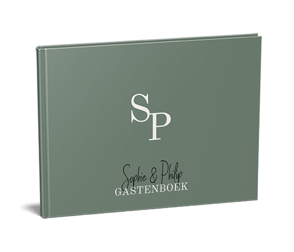 Gastenboek in donkergroen met witte initialen en hartje. Specificaties van het gastenboek