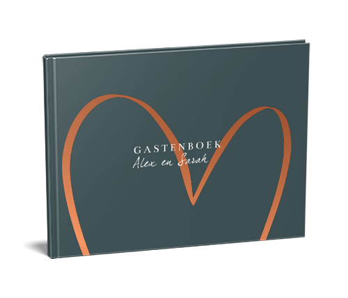 Stijlvol, petrolkleurig gastenboek om mooie herinneringen in te bewaren aan een onvergetelijke dag! Aan de voorkant staat een deel van een koperkleurig hart met witte tekst erachter. Aan de achterzijde staat de trouwdatum in dezelfde koperkleur.