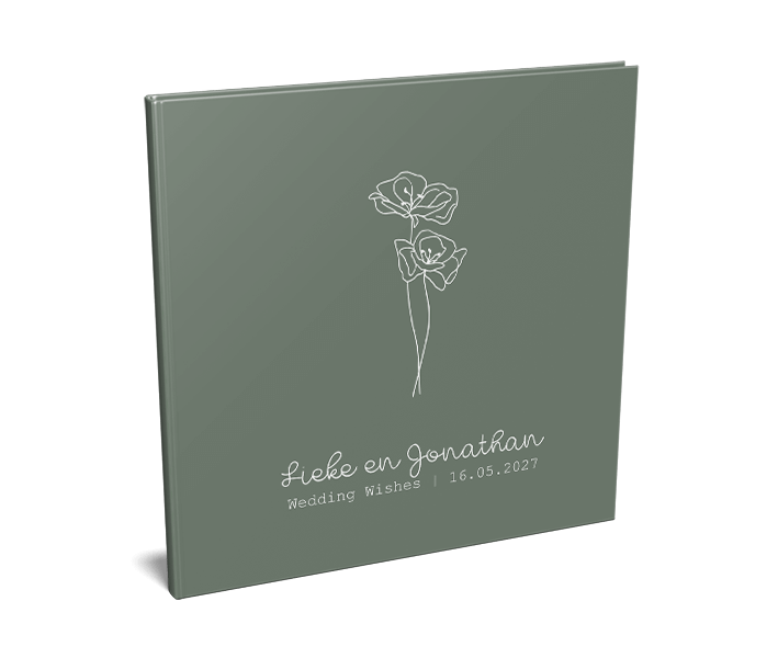 Stijlvol gastenboek 'line drawing green'; op dit vierkante groene gastenboek staat een witte lijntekening van twee bloemen.