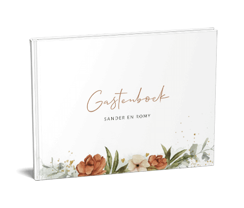 Prachtig gastenboek om mooie herinneringen te bewaren aan een onvergetelijke dag! Op de voorkant staat onderaan het bloemendesign in oranje, groen en wit op waterverf. Aan de achterzijde staat een klein goudkleurig hartje in het midden.