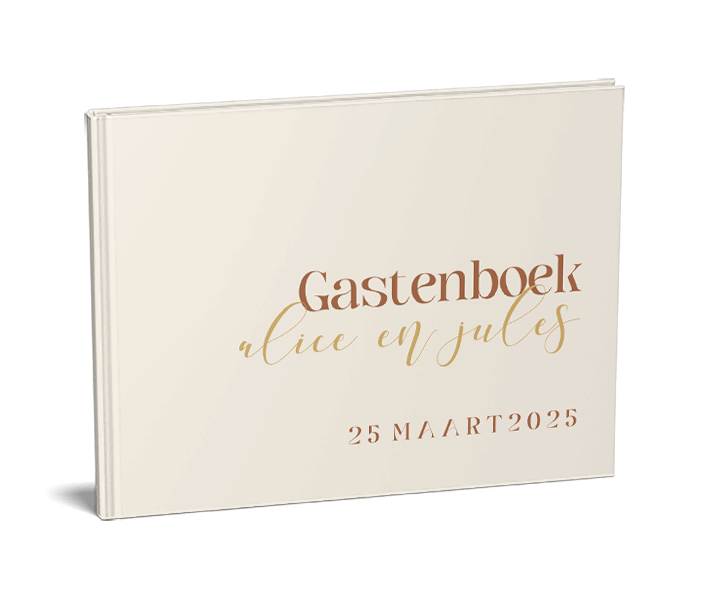 Bijpassend gastenboek bij de trouwkaart met warme kleuren, de tekst staat in verschillende trendy letters in warm bruin op een beige achtergrond, pas deze eenvoudig zelf aan in de online editor.