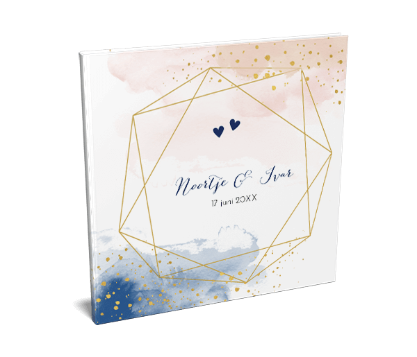 Een tof gastenboek voor jullie bruiloft met dit vierkante boek kunnen jullie gasten een boodschap schrijven. Dit gastenboek hoort bij de trouwkaart met geometrische vorm in goudlook en aquarel en goudkleurige confetti.