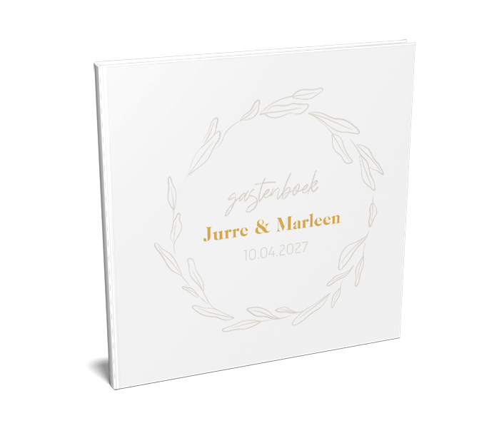 Stijlvol wit gastenboek met takjeskrans en namen in goudkleur