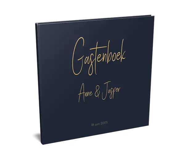 Dit vierkante gastenboek met een diep donkerblauwe achtergrond en sierlijke gele letters straalt minimalistische elegantie uit. Perfect afgestemd op jullie trouwkaart en de stijl van de bruiloft!