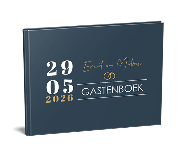 Donkerblauw gastenboek in strak design met moderne typgrafie in wit en goudgeel. De namen staan in sierlijk handschrift met goudkleurige trouwringen eronder.