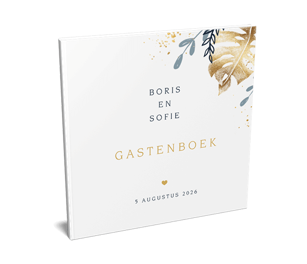 Stijlvol wit gastenboek met een tekening van bladeren in grijsblauw en goud in de hoeken. Deze kleuren komen ook terug in de tekst, het kleine hartje zorgt voor een romantisch accent!