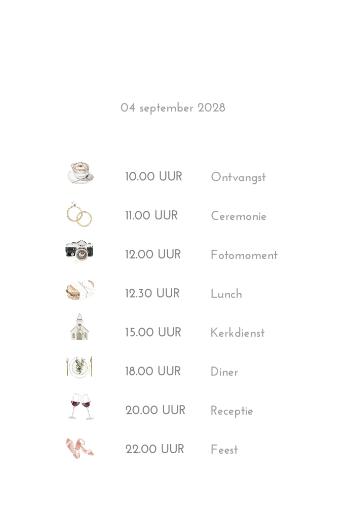 Ontwerp een stijlvolle dagprogrammakaartje bij de trouwkaart. Dit is een kaartje met goudfolie en het programma van de dag in icoontjes.