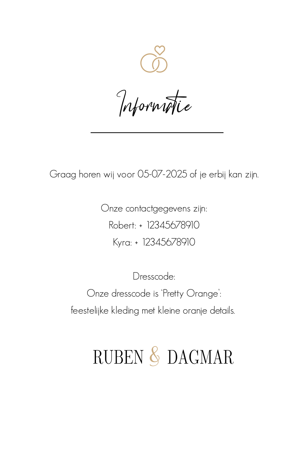 Stijlvol wit inlegvel met tekst in zwart in verschillende lettertypes. Boven de tekst staan goudkleurige trouwringen met een hartje erboven, het ampersand tussen de namen van het bruidspaar is ook in goudkleur.
