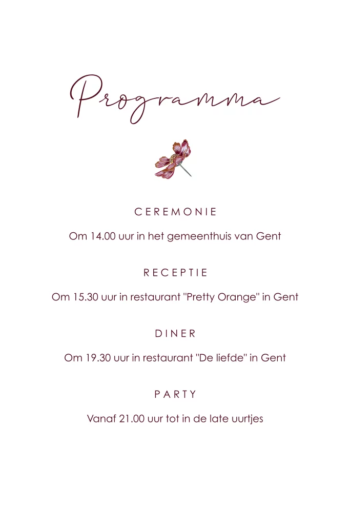 Stijlvol inlegvel met een tekening van een donkerroze bloem, deze komt ook terug op de achterkant. De tekst staat in dezelfde rood roze kleur in verschillende lettertypes.