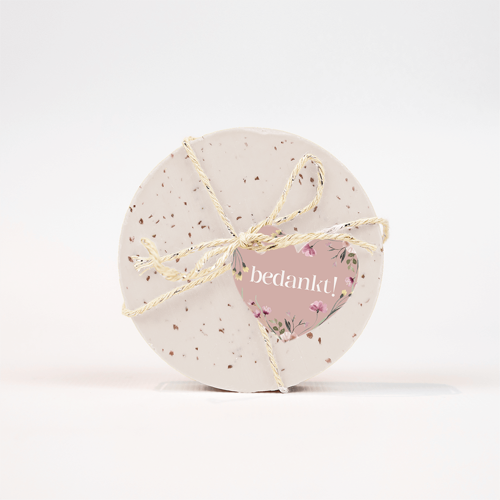 Maak een labeltje in de vorm van een hartje met bloemetjes. Dit labeltje kun je dankzij het gaatje zelf aan je bedankje vastmaken. In de editor kun je het labeltje bewerken. Let op dat dit een klein kaartje is waar niet veel tekst op kan.
