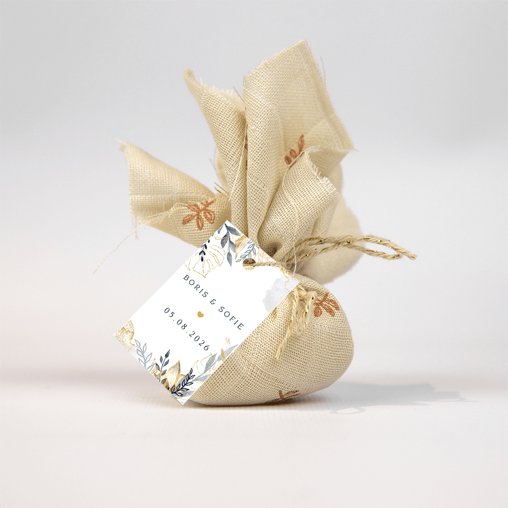 Echt stijlvol, dit trouwlabel in zachtgrijs en geelgoud! Langs de rand mooi getekende bladeren met aquarel. Tussen de namen en de datum een klein hartje als romantisch accent.