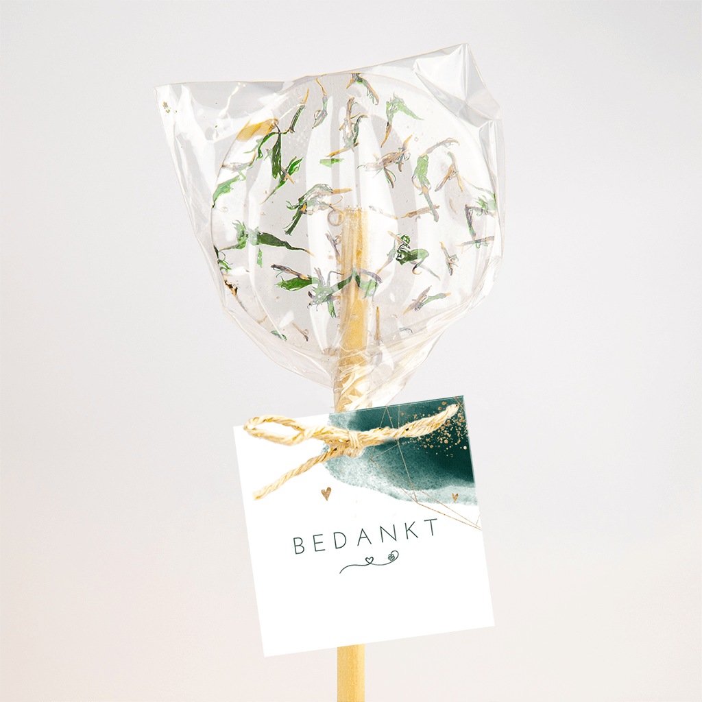 Vierkant wit trouwlabeltje met donkergroene waterverf in de hoek, waarop goudkleurige geometrische lijnen, goudspetters en hartjes te zien zijn. Onder de tekst in bijpassende kleur staat een lijn met een hartje.