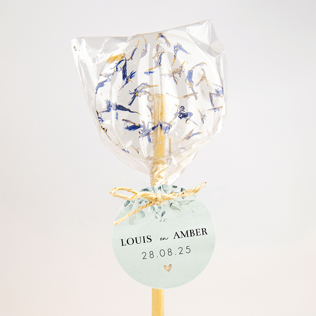 Stijlvol trouwlabeltje in mintgroen met het design van eucalyptus takjes bovenaan. Middenin de namen van het bruidspaar en de trouwdatum met een klein hartje eronder.