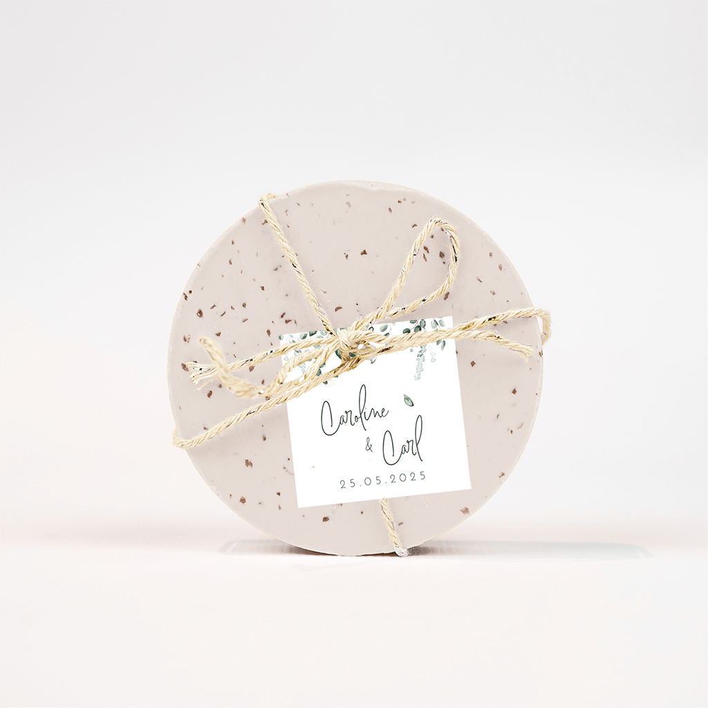 Mooi vierkant labeltje voor jullie trouwdag met bovenaan groene eucalyptustakjes in aquarel en daaronder de namen van het bruidspaar in trendy letters en de trouwdatum. Pas de tekst eenvoudig zelf aan in de online editor, zo gedaan!