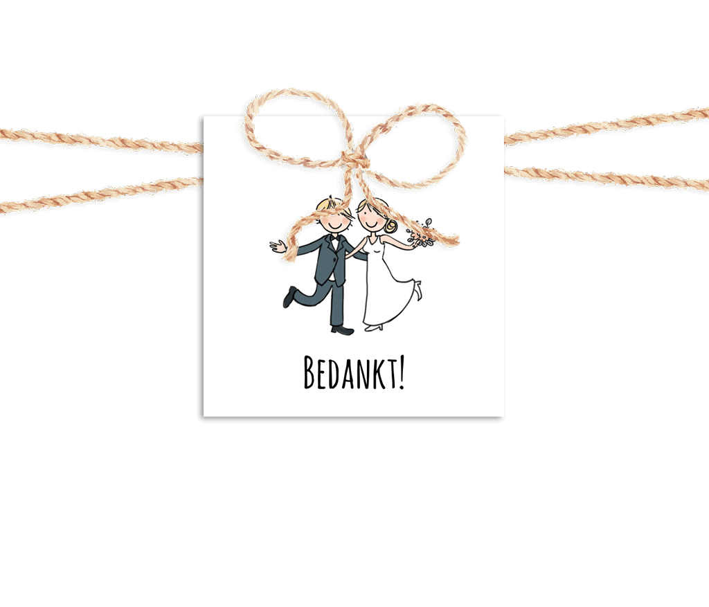 40x40 mm vierkant labeltje met cartoon van bruidspaar. Labeltje kan je gebruiken om bedankjes te versieren en te personaliseren