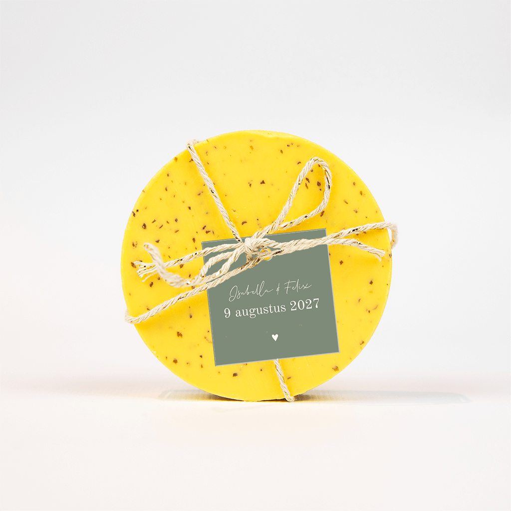 vierkant labeltje met groene achtergrond en witte tekst. Onderin staat een schattig klein hartje. De afmeting van het labeltje is 40x40mm