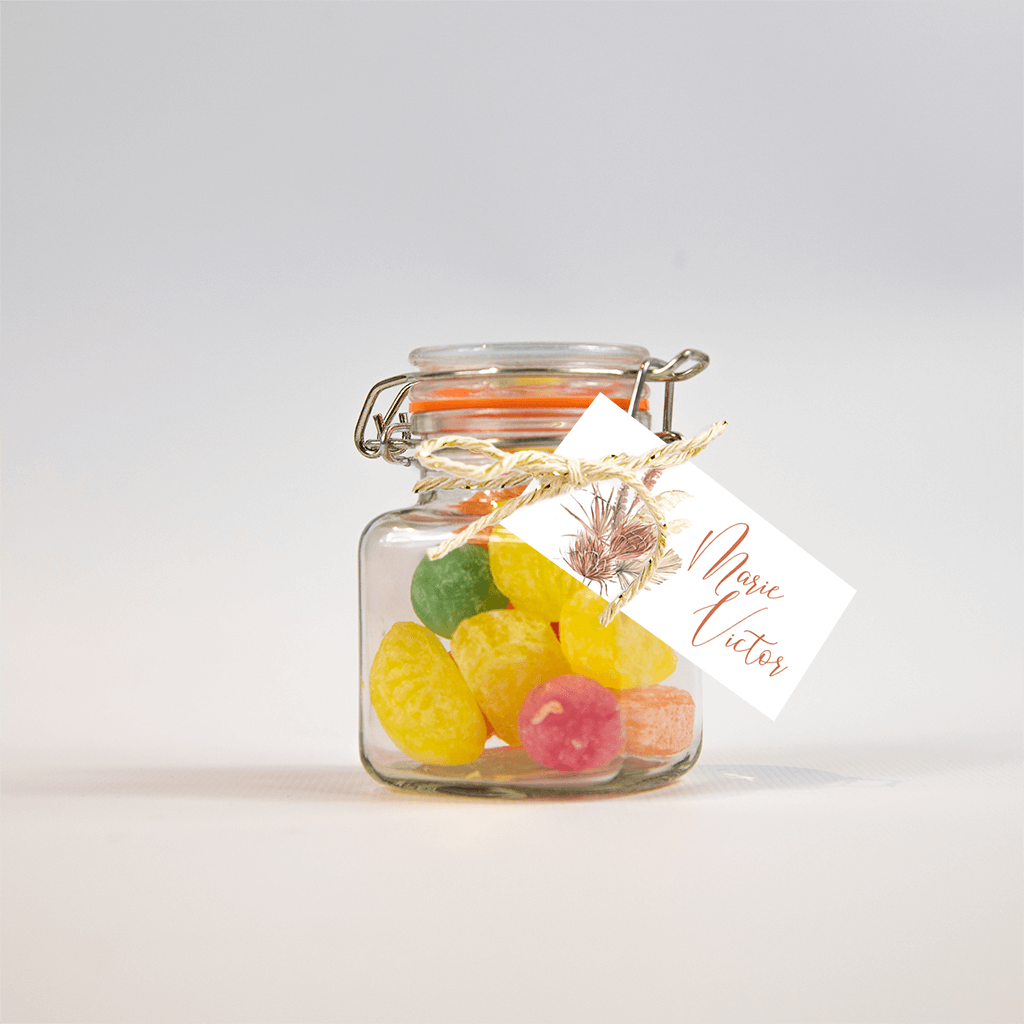 Mooi labeltje voor de trouwbedankjes in dezelfde stijl als de trouwkaart. Naast een toef droogbloemen staan de namen van het bruidspaar in sierlijke letters en bijpassende kleur, trendy!
