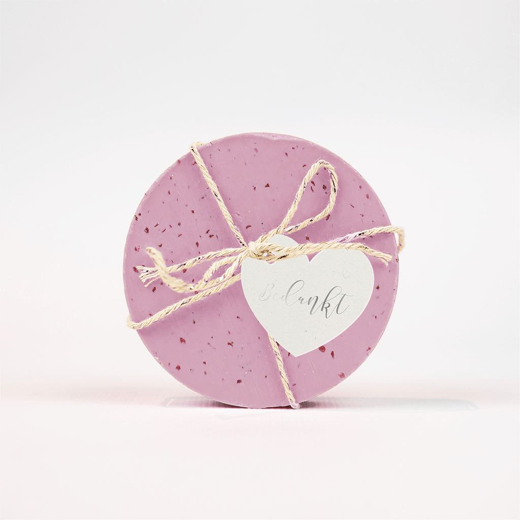 Grijs trouwlabeltje in de vorm van een hart, de tekst staat in sierlijke letters in zilverfolie druk.