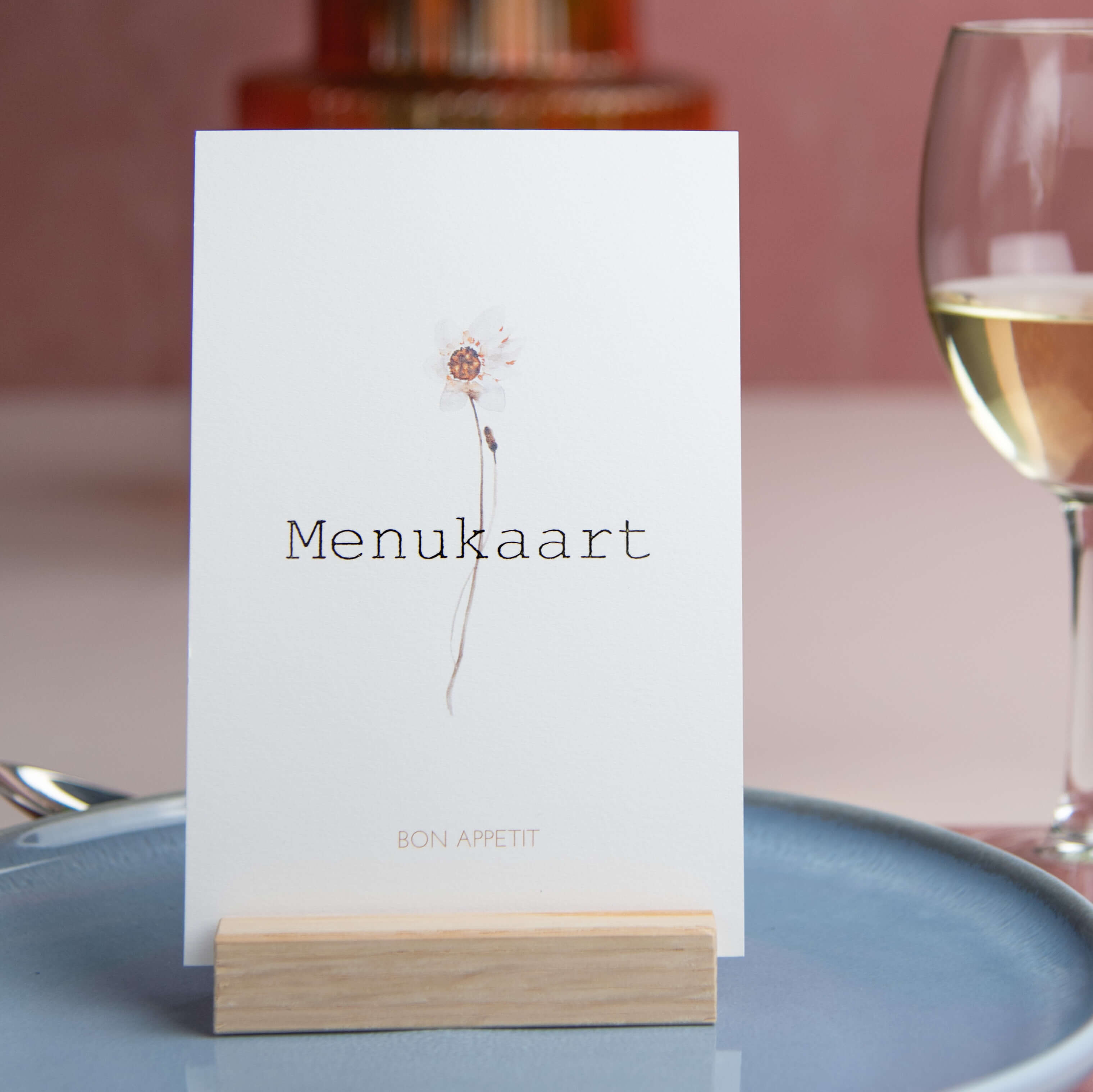 Stijlvolle menukaart, hiermee maken jullie er een chique huwelijksdiner van ! Op een zachtroze pastelachtergrond staat een getekende bloem. 'Menukaart' staat in luxe goudfoliedruk, op de achterzijde staat een overzichtelijk menu in duidelijke bruine typografie.