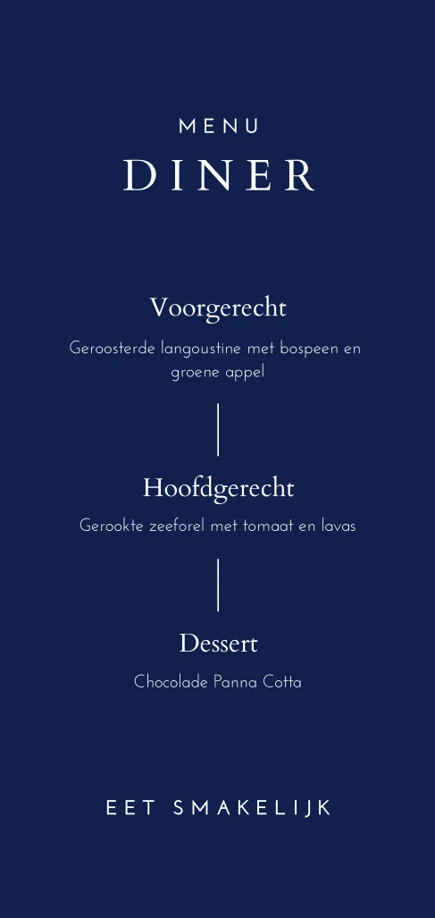 Chique menukaart met donkerblauwe achtergrond en de tekst van het menu in wit, modern lettertype. Op de witte achterzijde staan de drankjes in donkerblauw vermeld, zo krijg je een mooi geheel. Strakke kaart voor op een feestelijke diner tafel, bon appétit!
