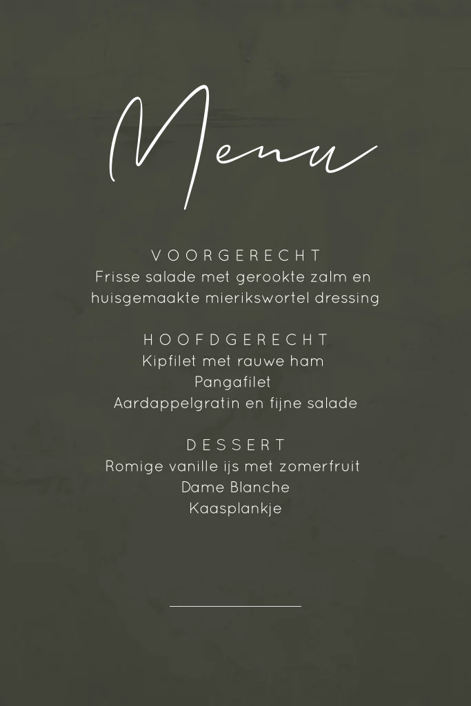 Chique menukaart voor het huwelijksdiner, een mooi accent op een feestelijk gedekte tafel! De kaart is in diep donkergroen, de tekst van het menu is in witte letters, goed leesbaar op de donkere achtergrond. Door gebruik van roségoudfolie bij 'menu' en op de achterkant krijgt de kaart een luxe uitstraling.