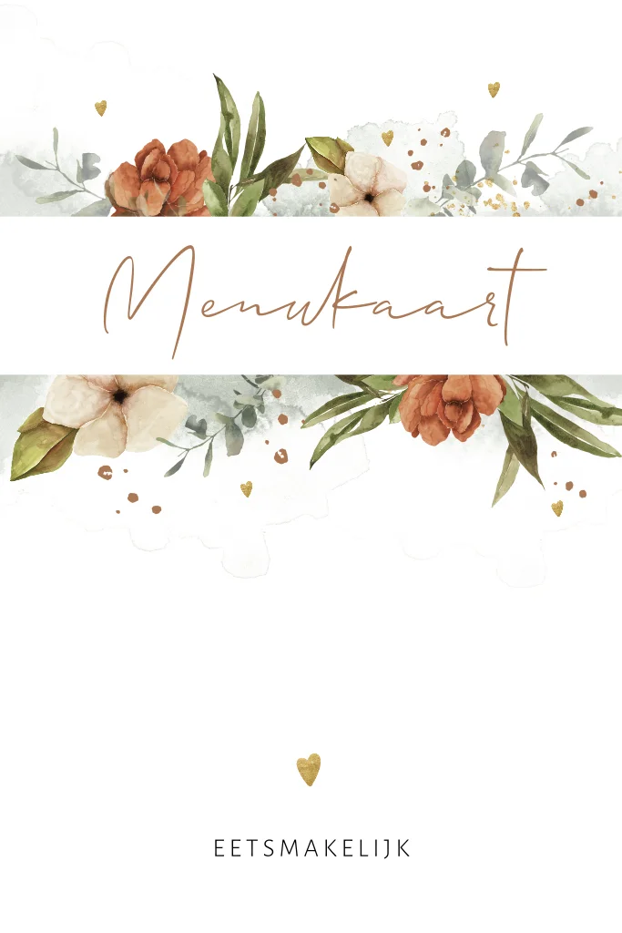 De menukaart in dezelfde stijl als jullie trouwkaart. De menu kaart heeft een stijlvolle en romantische look met prachtige kleurrijke bloemen. Pas het menu aan naar jullie eigen wensen in de online editor.