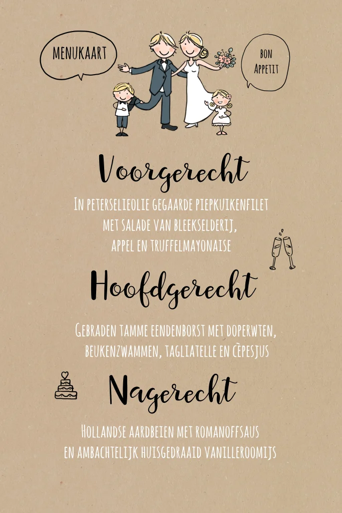 Originele menukaart met een vrolijke cartoon van een dansend bruidspaar met kinderen op een achtergrond van kraft karton. De achterzijde van de kaart is goudgeel.
