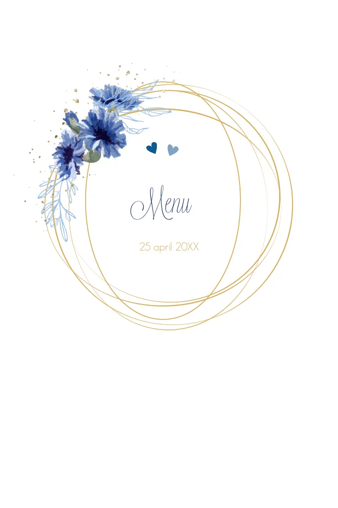 Stijlvolle witte menukaart met een goudkleurige krans en een toef van blauwe bloemen in waterverf. Net als bij de trouwkaart staan er blauwe hartjes in de krans. Boven het menu op de achterkant staan ook blauwe bloemen, de tekst is in bijpassende kleuren in sierlijk handschrift, deze pas je eenvoudig zelf aan in de online editor.