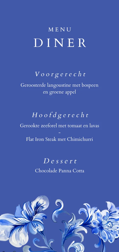 Stijlvolle menukaart in het Delfts blauw thema en prachtige bloemen details onderaan de menukaart