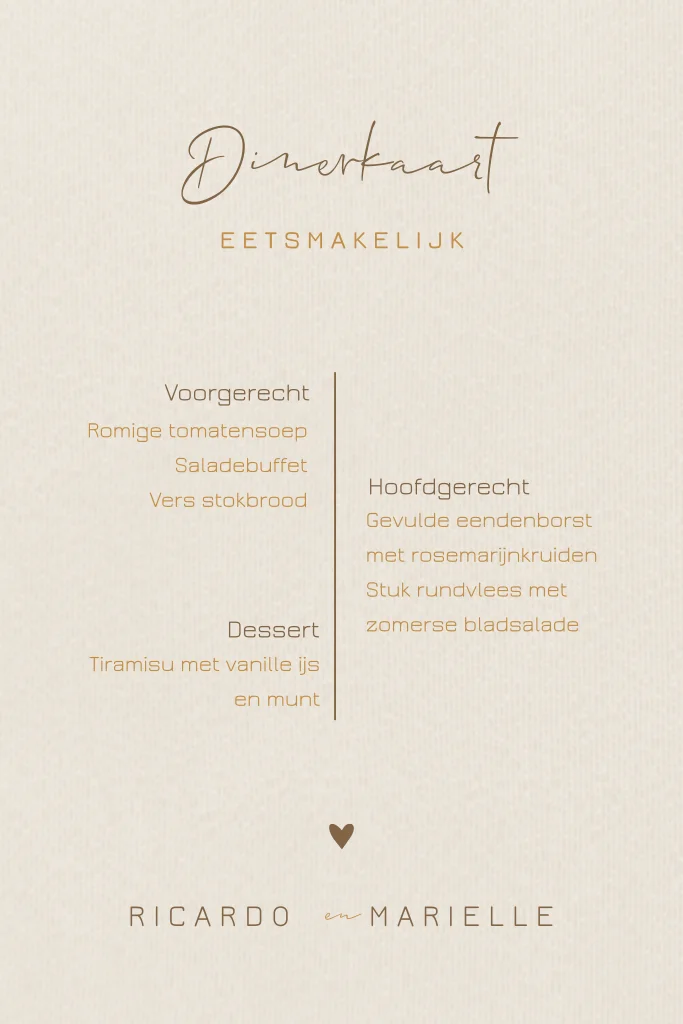 Beige menukaart met elegante typografie in verschillende kleuren bruin. Aan de voorkant het overzichtelijke menu, aan de achterkant staan de drankjes zodat iedereen kan proosten op het bruidspaar!