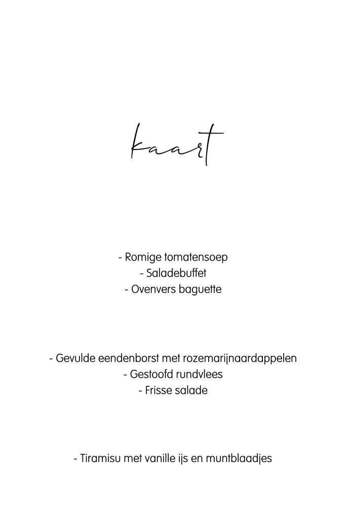De menukaart in dezelfde stijl als jullie trouwkaart. De menukaart heeft roségoudfolie tekst en een witte achtergrond. Pas het menu aan naar jullie eigen wensen in de online editor.