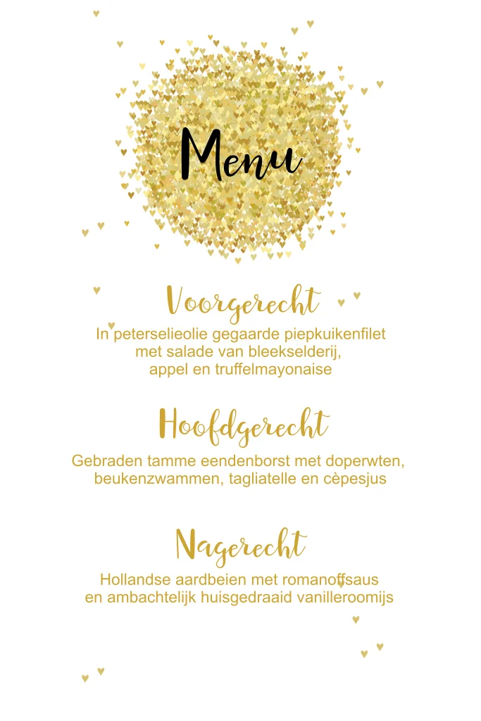 Stijlvolle menu-kaart voor op de tafel tijdens het diner op jullie trouwdag. Met goudlook hartjes confetti is deze kaart echt chic!