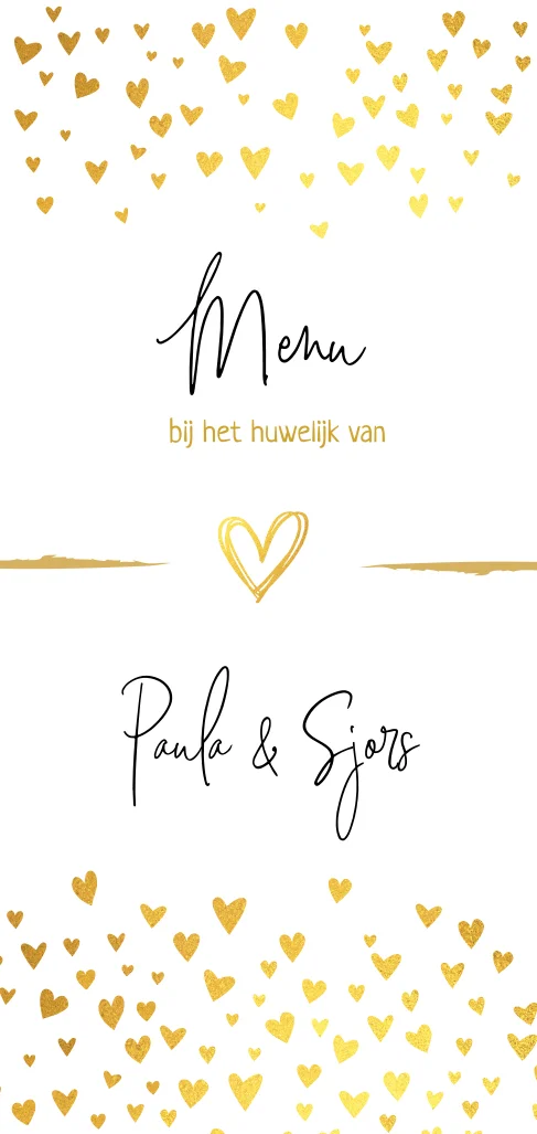 Romantische menukaart met boven- en onderaan de kaart een wolk van gouden hartjes en een groter hartje in het midden. De trendy typografie maakt deze kaart helemaal af!