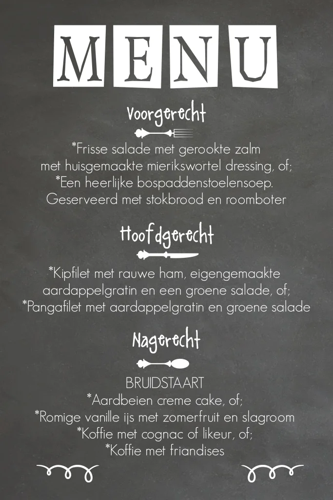 MENU is ready! Wat een stoere uitstraling heeft deze menukaart in krijtbordlook. Op de zwarte achtergrond is witte tekst geschreven en zijn leuke bestek-icoontjes geplaatst. Vinden jullie hem ook zo tof? Schrijf je receptideeën dan op deze kaart! Deze menukaart heeft een bijpassende trouwkaart