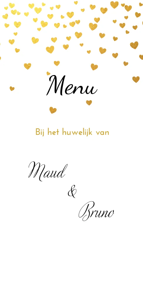 Trendy menukaart voor het diner bij jullie huwelijk. Bovenaan een vrolijke regen van gouden hartjes. De tekst staat in een stijlvol lettertype.