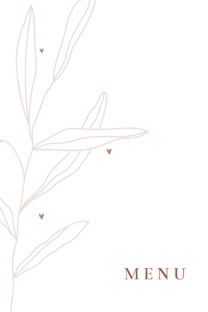 Stijlvol, deze witte menukaart met een mooie lijntekening van takjes in pasteltint. Rond de takjes op de voor- en achterkant staan romantische hartjes in roodbruin, de moderne tekst is in dezelfde tint, in het menu afgewisseld met zwarte typografie, chique kaartje!
