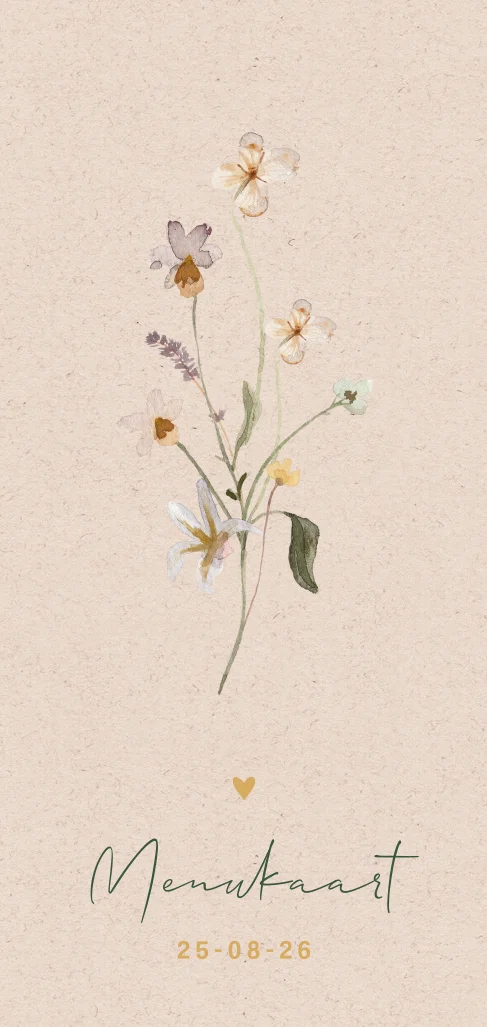 Oudroze menukaart met geschilderde veldbloemen in zachte pastelkleuren, stijlvolle kaart voor een feestelijke dinertafel! De tekst staat in sierlijk handschrift in bijpassende kleuren, tussen de menugangen staat net als op de voorzijde een klein hartje.