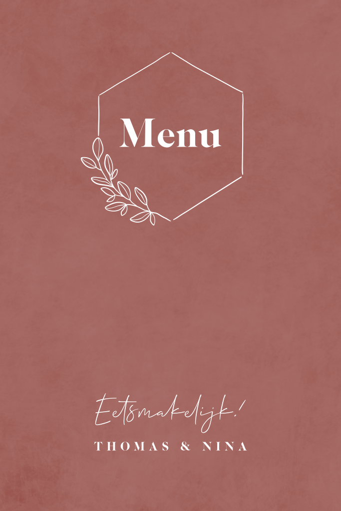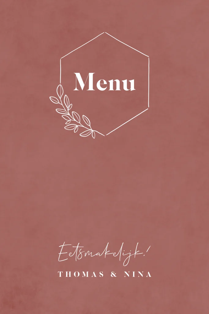 Een menukaart in dezelfde stijl als jullie trouwkaart. De menukaart heeft een moderne uitstraling met een hexagoontje en speels takje. De achtergrond van de kaart is een bruin-roze velvet-look.