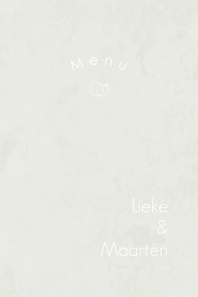 Mooie stijlvolle menukaart met ringen van roségoudfolie op de voorzijde op een neutrale velvet structuur achtergrond. De achterzijde is wit, pas de teksten hier zelf naar wens aan in de online editor.