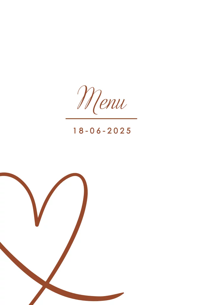 Hippe menukaart met een sierlijk getekend roodbruin hart in de hoek onderaan. Het hart komt ook op de achterkant twee keer terug, de teksten zijn in dezelfde kleur. Pas deze eenvoudig zelf aan in de online editor en maak er een persoonlijke kaart van, bon appétit!