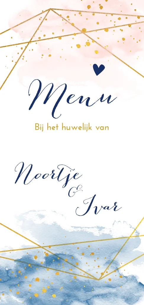 Moderne menukaart met roze en blauwe waterverfvlakken met goudkleurige confetti. Over de kaart geometrische lijnen in goud. De tekst staat in een sierlijk lettertype in bijpassende kleur, met een klein hartje erboven.