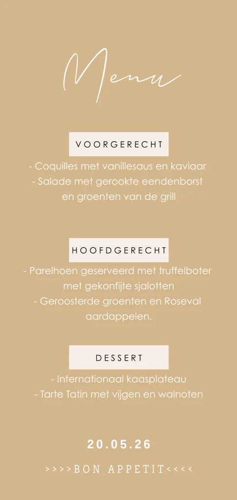 Menukaart in zandkleur en goudfolie