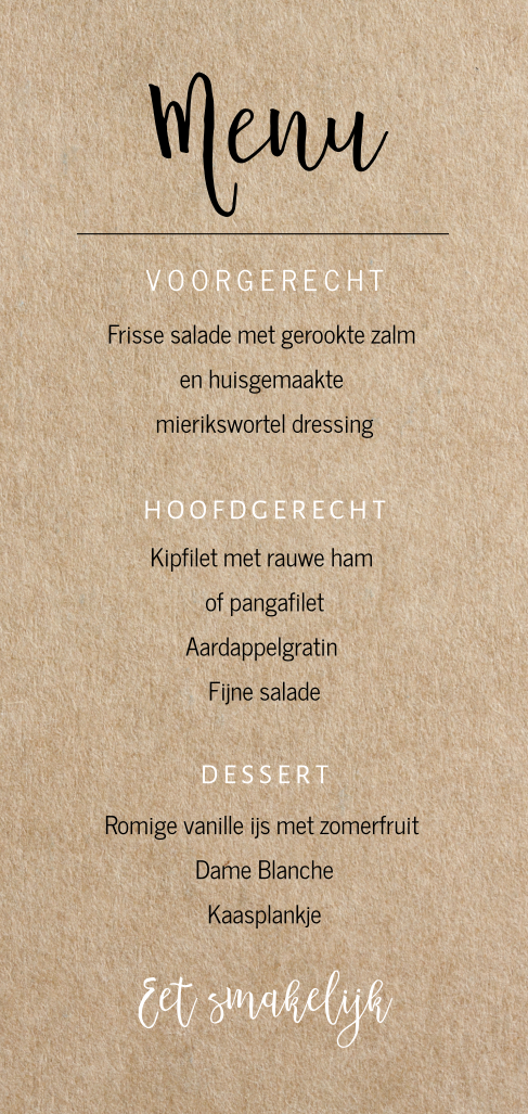 Deze hippe menukaart is in dezelfde stijl als jullie huwelijksuitnodiging, echt trendy! Op de kraft achtergrond komt de tekst in verschillende lettertypes mooi naar voren. Door het gebruik van zwart en wit maak je de informatie op de kaart goed overzichtelijk.