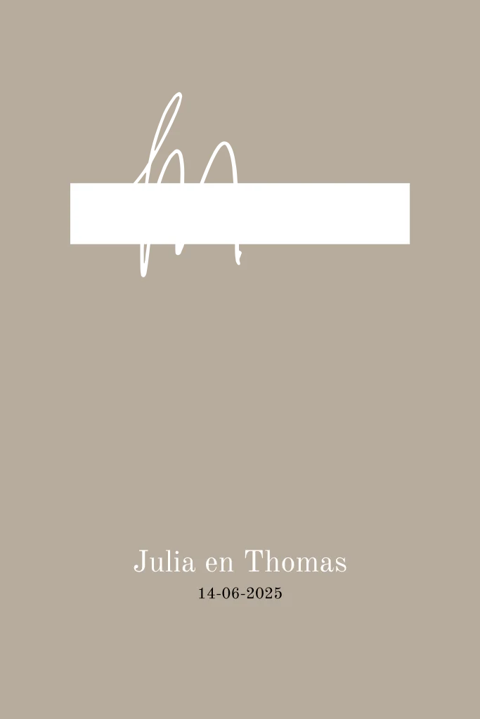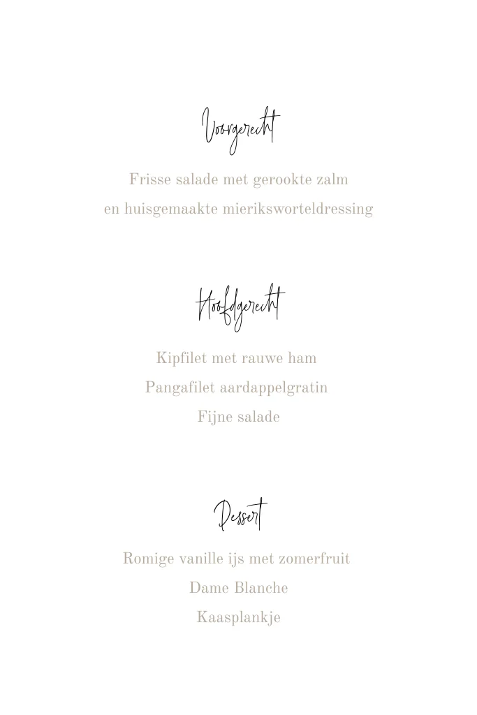 Stijlvol, deze taupekleurige menukaart met trendy typografie! De binnenzijde is wit, hier is ruimte om het complete menu te plaatsen in verschillende lettertypes. Op de beige achtergrond staat 'menu' in een wit vlak, de tekst is afwisselend zwart en wit, aan de binnenzijde wordt met de tekst afgewisseld in beige en zwart.