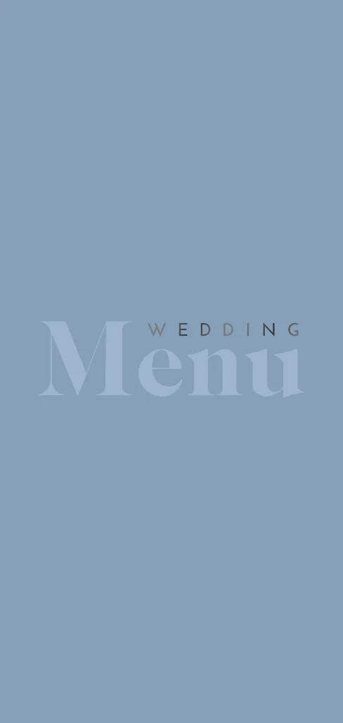 Hippe menukaart in lavendelblauw met tekst in zwartfolie en lichtblauw in stoere letters. Op de witte achterzijde is ruimte voor de verschillende menugangen, de tekst is in bijpassende kleuren, eet smakelijk!