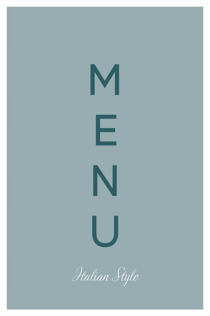 Deze moderne menukaart maakt jullie huwelijksdiner helemaal compleet. Op de grijsblauwe voorzijde staat 'menu' in een strak lettertype. Door gebruik van verschillende kleurvlakken in blauw op de achterzijde en helderwitte tekst heb je het complete menu overzichtelijk op een rij: eet smakelijk!
